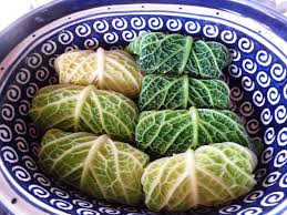 - Les rouleaux: – Poser devant vous 1 feuille de chou ( retirer aux 3/4 la côte centrale si elle est très grosse). Déposer dessus une part de farce ( 1/8 ème) et rouler la feuille autour après, dès le 1er tour, avoir rentré les 2 extrémités vers le centre …. continuer à rouler un peu serré jusqu’au bout. — Recommencer pour chaque feuille.