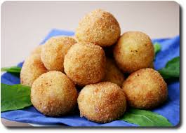 - A l’aide de 2 cuillères à soupe, prélever du riz et former des boulettes que vous roulez 1) dans la chapelure + 2) dans les oeufs en neige et 3) à nouveau dans la chapelure…………….. puis plonger les boulettes, en procédant en plusieurs fournées pour ne pas qu’elles collent entre elles, dans l’huile bouillante …. pour 4 à 5 mn en les tournant plusieurs fois pour qu’elles soient uniformément dorées …….. Sortir les croquettes pour les déposer sur du papier absorbant couvert d’une feuille d’alu pour garder les croquettes au chaud..