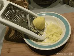 - Râper les 650 g de pommes de terre nouvelles. Les poser dans un torchon et bien serrer pour extraire un maximum de jus…. Les passer au moulin à légumes pour les réduire en purée ( à cru).