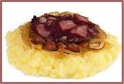 - Pour servir, déposer pommes et pommes de terre sur un plat … Recouvrir d’oignons & lardons.