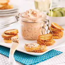 - Dans un saladier, pour en faire des rillettes, travailler à la fourchette saumon + anchois + vinaigre + Tabasco ………. + la crème fraîche ……… + le beurre peu à peu, coupé en petites parcelles + sel …….. pour obtenir une préparation homogène.