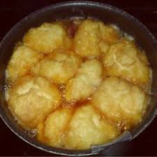 En procédant par plusieurs fournées de 6 ou 8, par petites cuillerées, prendre de la pâte et la déposer dans le sirop où ont cuit les pommes. Couvrir. Laisser doucement cuire 20 mn.…….. Sortir ces premiers Grands-pères à l’écumoire et recommencer avec le restant de pâte ….. et ainsi jusqu’à épuisement de la pâte.