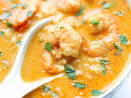 **Verser le lait de coco + sel + poivre + crevettes + champignons. Réchauffer 3 mn .……. Ajouter sauce de poisson + jus de citron + coriandre ciselée. Mélanger 1 mn .. et servir très chaud.