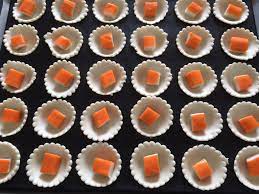 Découper les bâtonnets de surimi en tranches moyennes… Disposer 1 tranche au fond de chaque moule ….. Recouvrir avec la préparation précédente.
