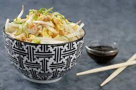 - Pour servir: -Verser le vermicelle dans un plat de service. Entourer le plat du reste de germes de soja. Parsemer de feuilles de coriandre déchiquetées + des fines lanières de piment + des lamelles d’omelette.