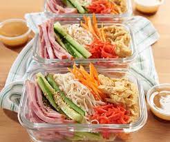 Bien égoutter les pâtes (somen). Les répartir dans 4 plats individuels ou assiettes………………. Recouvrir les pâtes de jambon + tomates + concombre + champignons + crevettes.…….