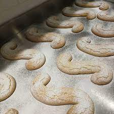 ** Etaler la pâte sur 1 cm d’épaisseur….. Y découper des « S » en coupant des lanières que vous tordez…. Disposez au fur et à mesure les « S », un peu espacés, sur la plaque du four.