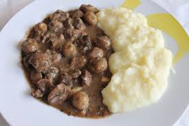 **A la place du rognon, mettre le bacon jusqu’à ce qu’il soir croustillant …. Poudrer de farine et remuer 1 mn ………… puis ajouter échalotes + vin rouge + muscade + sel + poivre et amener à ébullition ……………. + moutarde + champignons. Mélanger 2 à 3 mn …