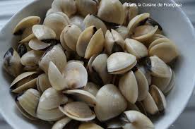 Faire tremper les coques qq heures dans une passoire plongée dans de l’eau froide afin qu’elles rejettent leur sable ——– OU BIEN, rincer les coques. Les poser dans une poêle sur feu vif + 1/2 verre d’eau pour 3 à 4 mn.. Elles rejetteront leur sable dans l’eau…. Les égoutter et les rincer.