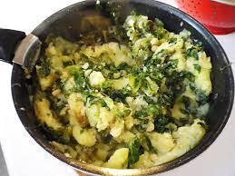 - Egoutter les pommes de terre … Les écraser en purée en incorporant peu à peu le lait chaud + le beurre coupé en morceaux …….. + le contenu de la poêle avec la salade …….. + ail ……. + muscade + sel + poivre. Bien mélanger et poser éventuellement 2 mn sur feu doux pour réchauffer.