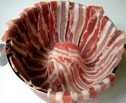 ** Tapisser le moule avec les fines tranches de lard en les laissant dépasser un peu ……… Remplir le moule de la préparation aux pommes de terre ………… Rabettre les tranches de lard qui dépassent sur le dessus.