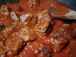 ** Placer les cubes de viande et leur sauce de cuisson dans la sauce tomate précédente + les olives + le céleri. Couvrir. Laisser doucement mijoter 2 heures à 2 h 1/2 en ajoutant un peu d’eau si la sauce se fait trop courte.