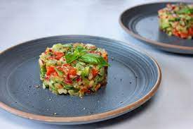 Tailler en brunoise ( = en mini dés) carotte + fenouil + céleri + tomates…. + câpres + cornichons.