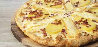 - Déposer la pâte étalée, dans un moule ou pas, sur une plaque du four ………. Etaler dessus la fondue de tomates ……….. Répartir les dés de pommes de terre + les lardons…….. Recouvrir avec les tranches de fromage.
