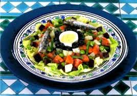 *Détacher, laver et essorer les feuilles de laitue. Les étaler sur un plat. Arroser d’1 filet d’huile d’olive. Saler, poivrer…….. Recouvrir du mélange de légumes du saladier …………… Décorer de dés de betteraves + quartiers d’oeufs + olives.