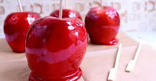 *** Dès que les pommes sont cuites, les sortir du four et les placer sur un plat.…….. Leur enfoncer chacune un bâton de sucette ou un pic à brochette.