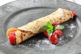 Emietter le reste des macarons sur les crêpes roulées + qq framboises fraîches.