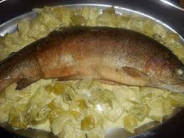 - Dans un plat pour le four, étaler les poireaux. Saler, poivrer. Poser les truites par dessus. Pimenter, muscader, saler, poivrer … Napper de crème fraîche.