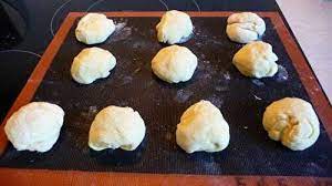 Rouler la pâte pour former un cylindre …….. Le diviser en tronçons. Garder la forme allongée de chaque grosse rondelle de pain ou bien la rouler en boules. Déposer ces morceaux de pâte, un peu éloignés, sur la plaque beurrée.