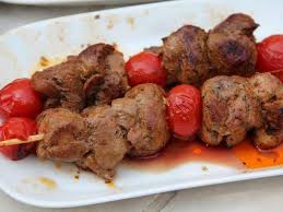 Façonner les brochettes en alternant 1 cube de viande + 1 rognon entouré de lard + 1//2 tomate + 1 saucisse cocktail + 1 champignon … et recommencer. Faire ainsi 6 brochettes….. Les napper du reste d’huile. Saler, poivrer.
