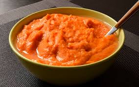 - Ecraser en purée la chair de potiron. La travailler dans un saladier + fécule + levure + poudre d’amandes + sucre + suce vanillé + cannelle + muscade + zeste de citron râpé + crème fraîche ... pour obtenir une préparation homogène.