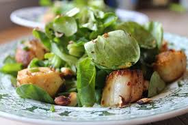 Dans une poêle bien chaude, sur feu vif, chauffer 1 c à s d’huile. Y déposer les pignons + les st Jacques pour 1 mn….. Les retourner. Verser le vin blanc. Eteindre aussitôt le feu sous la poêle et laisser les st Jacques 1 mn … puis les sortir pour les déposer sur la salade.