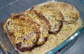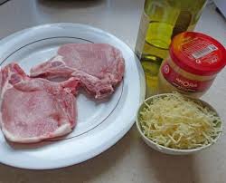 Transférer les côtes de porc cuites dans un plat à gratin. Les arroser du jus de cuisson de la poêle……… Les couvrir du contenu du bol et les recouvrir de lamelles de fromage.