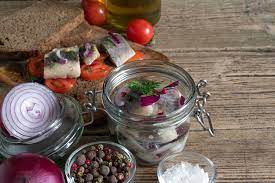 - Dans une terrine ou un grand bocal, installer les tronçons de harengs en les alternant avec rondelles de carottes + d’oignons + de raifort + feuilles de laurier + gingembre + poivre + moutarde.