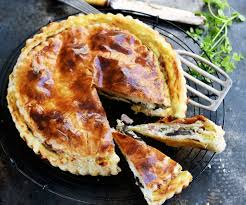 Beurrer et fariner une tourtière. Y disposer 1 rouleau de pâte feuilletée en la laissant dépasser un peu ….. Placer au frigo.