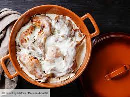 …. Incorporer 30 cl ( 300 g) de crème fraîche. Mélanger. Couvrir à nouveau. Laisser doucement terminer la cuisson environ 15 mn. ( surtout ne jamais laisser bouillir, cela « casserait » la sauce !!).