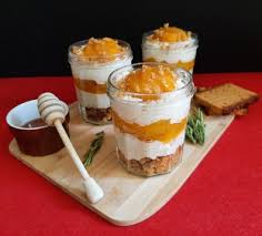 3) Découper 5 demi-abricots en petits morceaux …. Les répartir sur la couche de crème …….
