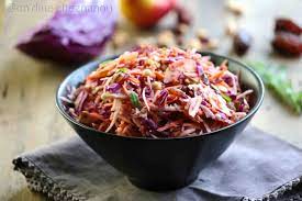 - Dans un saladier, bien mélanger les 2 choux + le céleri + les pommes + les noix hachées + le jambon …. + la sauce rémoulade. Travailler le tout 3 mn….
