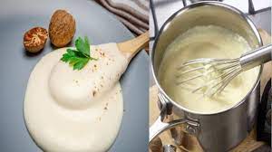 ** Pendant ce temps, préparer la Béchamel: Dans une casserole, fondre 50 g de beurre … Poudrer de farine et mélanger vivement 2 mn ….. Verser d’un coup le lait froid et fouetter jusqu’à obtenir une crème ferme et lisse .. Muscader, saler, poivrer.