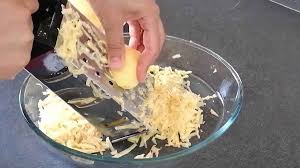 Sans les peler, faire cuire les pommes de terre 6 à 7 mn dans de l’eau bouillante ….. Les égoutter. Les peler. Les râper avec une grille à gros trous.