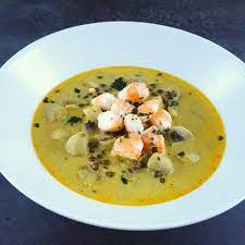 - Dans une casserole, fondre le beurre. Y faire doucement suer le céleri 5 mn ……………. Poudrer de farine + le curry et mélanger vivement 2 mn ……………….. Verser peu à peu le bouillon sans cesser de touiller jusqu’à épaississement ……………… Ajouter concombre + zeste râpé de citron + crevettes décortiquées + Xérès. Réchauffer 2 à 3 mn……
