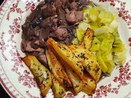 Dans une casserole sur feu doux, chauffer 50 g de beurre, faire suer et blondir les oignons en remuant souvent ( 10 mn) ……………… Poudrer de farine et touiller vivement 2 mn …………. Arroser de vin rouge …. + ail + bouquet garni + sel + poivre + sucre + 4 épices. Laisser doucement mijoter 25 mn.