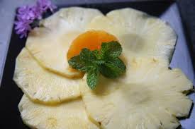 Peler l’ananas. Retirer le coeur dur. Couper l’ananas en très fines rondelles.