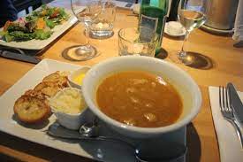 Dans un faitout, mettre les tronçons de poissons + oignon + échalotes + ail + carotte + poireau ….. + bouquet garni + persil + cerfeuil + clou de girofle + piment + sel + poivre …..+ le vin blanc + 2 litres d’eau. Porter à ébullition … puis couvrir à moitié et laisser cuire 1 h 30 mn à petit bouillon: la chair des poissons doit se défaire parfaitement.