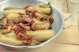 . POUR UN GRATIN: – Faire cuire comme ci-dessous mais sans les baies de genièvre …. Ranger les endives dans un plat à gratin huilé….. Recouvrir de plusieurs lamelles de fromage au cumin et faire gratiner 5 mn sous le grill du four.