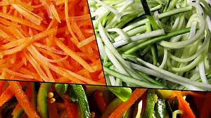 Peler les carottes. Les tailler en fin bâtonnets sur au moins 10 cm de long ( de la taille des bâtonnets du jeu de Mikado……….. Faire de même avec les courgettes sans les peler.