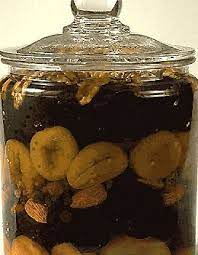 *** Dans 1 ou 2 bocaux, disposer joliment tous les fruits secs en couches successives …………… Arroser de sirop …. et compléter avec le Rhum ( ou le Whisky), que tous les fruits soient bien recouverts……
