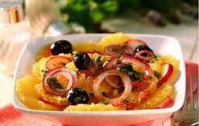 Peler le 1/2 oignon doux. L’émincer et séparer les demi-anneaux …. Les répartir sur les oranges………. + les olives + piment + cumin + huile + poivre. Mélanger délicatement.