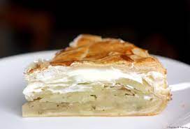 Beurrer et fariner une tourtière ( un moule à manqué). Y disposer 1 des rouleaux de pâte feuilletée en laissant un peu dépasser la pâte du bord.