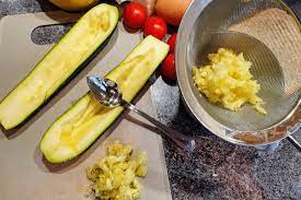 Couper 1 cm de chaque extrémité des courgettes ….. Couper les courgettes en 2 dans la longueur …… Creuser l’intérieur des courgettes en retirant les graines, en formant un sillon……..