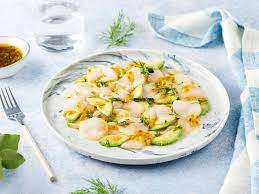 *** Sur 4 assiettes, étaler en couronne, en les alternant, quartiers d’orange/ lamelles d’avocat et lamelles de st Jacques.