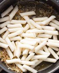 - Recette du Tokkbokki: – Dans un bol, bien mélanger pâte de piment + sauce soja sucrée ( ou sucre) + 1 c à s d’huile de sésame.