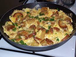 - Dans la poêle, sur feu vif, faire fondre le reste de beurre jusqu’à ce qu’il prenne une couleur noisette .…….. Verser le contenu du saladier et sans arrêt, avec une fourchette, repousser vers le centre les oeufs qui cuisent en premier vers les bords ……