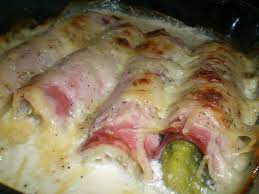 - Beurrer largement un plat pour le four………. Hacher grossièrement les 2 tranches de jambon restantes et les parsemer dans le plat……………………. Envelopper chaque poireau dans une demi-tranche de jambon et les disposer côte à côte dans le plat …………. Napper les roulades de sauce Mornay ……….. Parsemer du reste de Gruyère râpé ………
