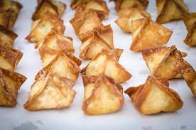 Avec les mains humides, replier chaque angle de carré de pâte vers le centre pour envelopper la farce .. et appuyer pour souder la pâte entre elle……