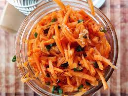 Egoutter les carottes qui ont trempé une nuit et les rincer dans plusieurs eaux froides. Bien les égoutter…. Les ajouter dans le saladier et mélanger 3 mn…….